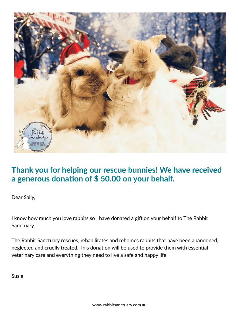 You can now donate to The Rabbit Sanctuary on behalf of your bunny loving friend or family member, and present them a beautiful gift certificate.